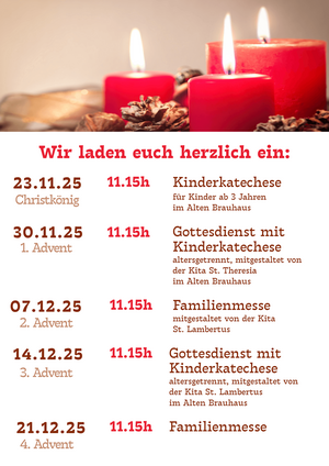 Natürlich sind ebenfalls alle herzlich zu den Familienmessen am 2. Advent (mitgestaltet von der Kita St. Lambertus) und am 4. Advent eingeladen.