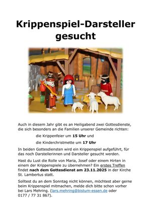 Auch in diesem Jahr möchten wir an Heiligabend (15 Uhr und 17 Uhr) wieder zwei schöne Krippenspiele gestalten. Damit das gelingt, brauchen wir viele begeisterte Mitspielerinnen und Mitspieler – ob als Engel, Hirten, Maria, Josef oder in einer der vielen anderen Rollen.
