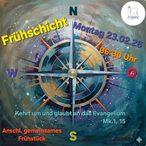 Unsere Frühschichten sind Wortgottesdienste, die in den frühen Morgenstunden um 06:30 stattfinden. Sie dienen dem bewussten Einstieg in den aktuellen Tag und gegebenenfalls den folgenden Wochen (z.B. Fasten- und Adventszeit). Sie beinhalten …
