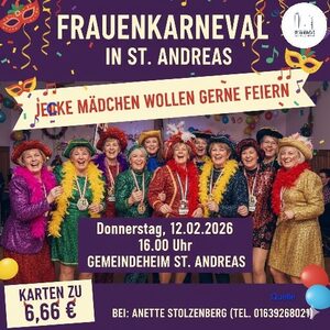 Am Donnerstag, dem 12. Februar 2026 feiern die jecken Mädchen von St. Andreas den Frauenkarneval um 16:00 Uhr im Gemeindeheim Odastr. 12. Karten zum Preis von 6,66 Euro gibt es bei Anette Stolzenberg, Tel. 0163 9268021 Herzliche Einladung an alle …