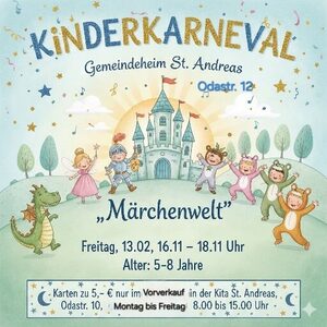 Im Gemeindeheim St. Andreas, Odastr. 12, feiern die Kinder von 5-8 Jahren von 16:11 Uhr bis 18:11 Uhr zum Thema "Märchenwelt" mit der KiTa St. Andreas Karneval.