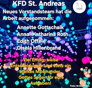 Annette Gottschalk, Anna-Katharina Roth, Edith Offele und Gisela Hillenbrand sind das neue Vorstandsteam der KfD in St. Andreas. Wir wünschen dem Team gutes Gelingen und Gottes Segen für die kommende Zeit.