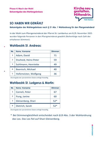 Am Sonntag, 30.11., wird in der Hl. Messe um 11:15 Uhr in St. Lambertus das neue Pfarreileitungsteam feierlich durch Herrn Generalvikar Klaus Pfeffer in das neue Amt eingeführt.